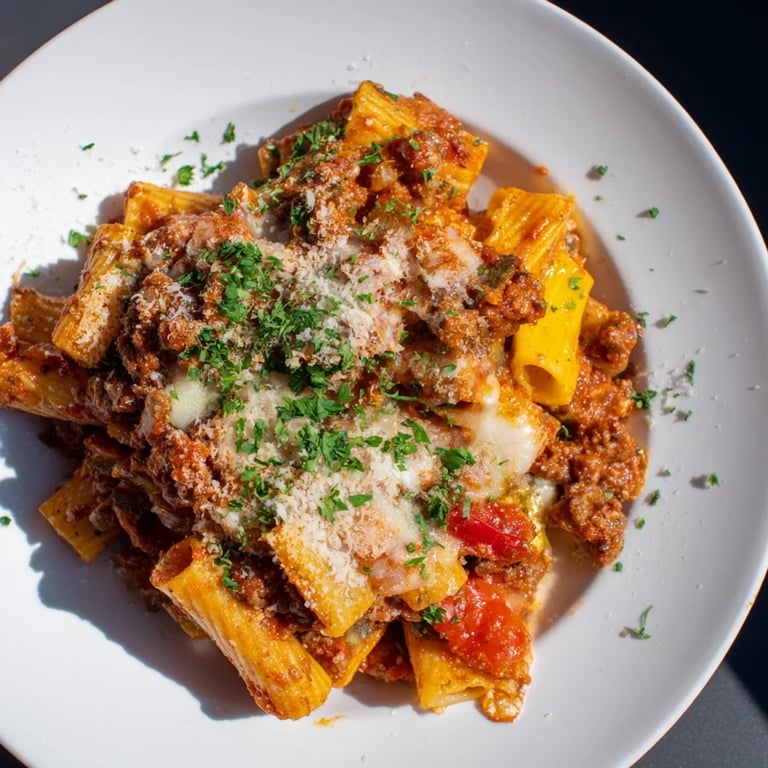 Save to Pinterest A hearty Italian-American casserole featuring rigatoni pasta, savory sausage, sweet bell peppers, and a rich tomato sauce, all baked under a blanket of melted cheese.