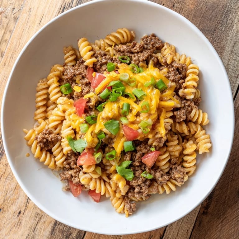 Save to Pinterest A one-pan, family-friendly dish blending the bold flavors of tacos with creamy, cheesy pasta for a quick and satisfying weeknight meal.