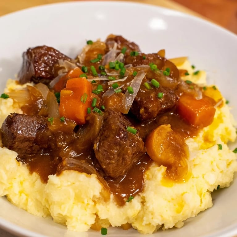 Save to Pinterest A cozy autumn dish featuring cider-braised beef stew served over creamy cheddar mashed potatoes with fresh chives comfort food perfect for chilly evenings.