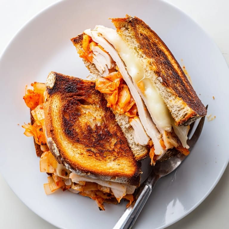 Save to Pinterest A bold and savory twist on classic grilled cheese, this sandwich features tangy kimchi, tender turkey, and sharp cheddar, all toasted to golden perfection.