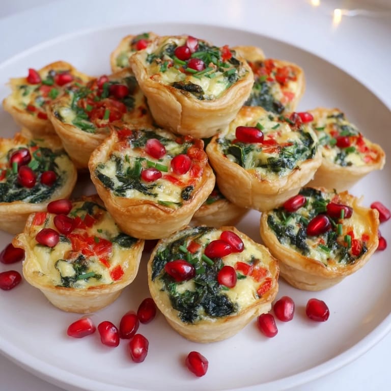 - Arrange the mini quiches in a tree shape on a large platter. Garnish with chives/parsley and scatter pomegranate seeds or extra diced red pepper as ornaments.