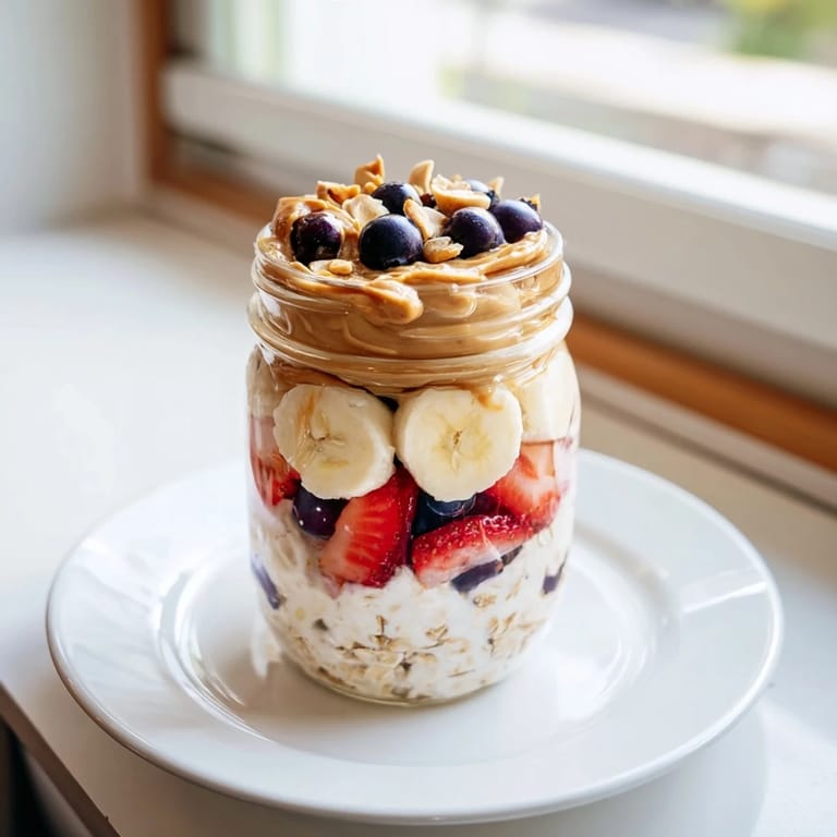 Save to Pinterest A creamy, nutritious breakfast featuring layers of oats, juicy fruit, and rich peanut butter, all prepared the night before for a quick and healthy start.