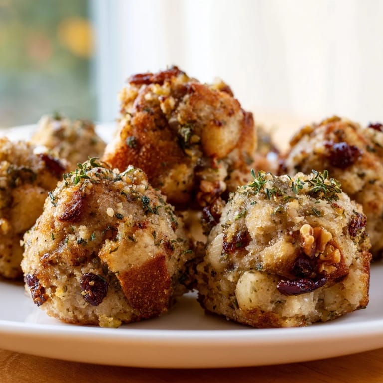 Save to Pinterest Savory, golden stuffing balls bursting with herbs and festive flavors—perfect for a speedy holiday side or appetizer.