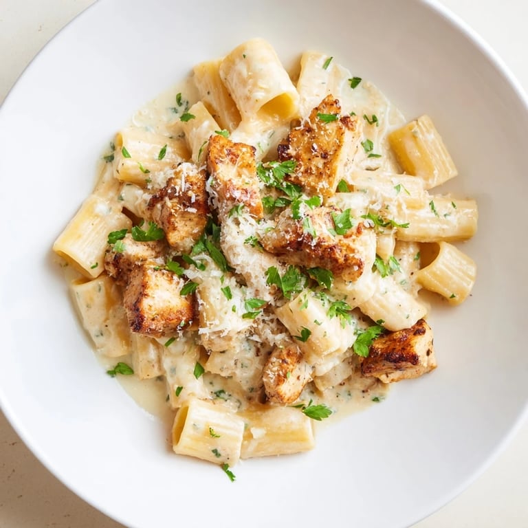 Save to Pinterest A comforting pasta dish featuring tender chicken, a rich garlic-Parmesan cream sauce, and perfectly cooked rigatoni. Ideal for a cozy weeknight meal or entertaining guests.