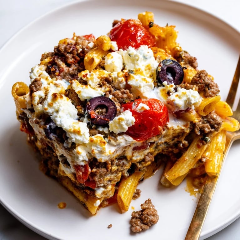 This Mediterranean-inspired dish combines tender penne pasta, spiced ground lamb, tangy feta cheese, and briny black olives for a comforting flavor punch. A creamy, yogurt-based tzatziki-style sauce enriched with lemon, cucumber, and dill ties all the ingredients together. After layering in an oven-safe skillet or pot, the pasta is baked until golden and bubbly. The result is a vibrant, satisfying main course that brings classic gyro flavors into a warm, shareable format. Fresh parsley or extra feta on top adds the perfect finish.
