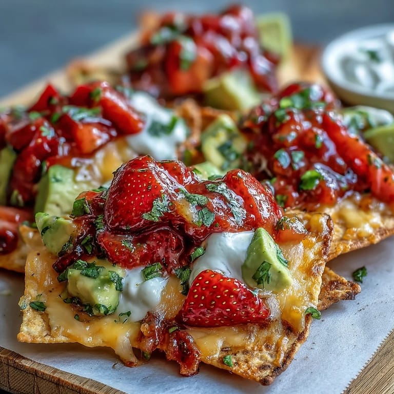 Serve this vibrant nacho board as the centerpiece of your appetizer spread at summer parties, game day gatherings, or casual weeknight dinners. Pair it with ice-cold margaritas, craft beer, or refreshing agua fresca for a complete Tex-Mex experience. For a full meal, serve alongside Mexican rice, refried beans, or a crisp green salad. The nachos are designed for sharing, so place the board in the center of the table with plenty of napkins and let everyone dig in. If you have leftovers of the strawberry salsa, it's delicious served with grilled fish or chicken the next day. This dish works beautifully for outdoor entertaining—just prep everything ahead and assemble right before serving for maximum freshness and visual impact.