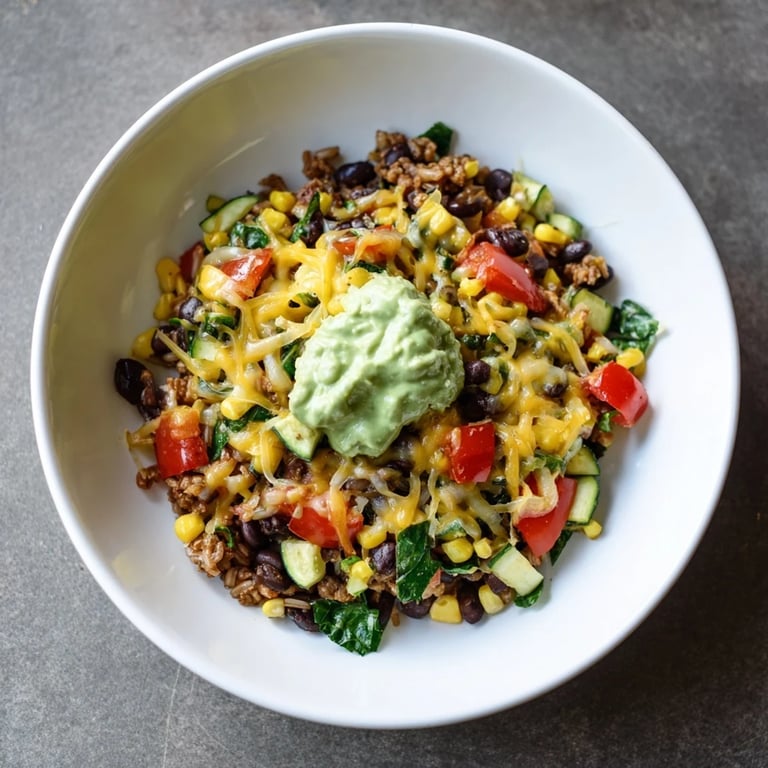 This veggie-packed taco skillet combines sautéed onions, bell peppers, zucchini, corn, tomatoes, and spinach with black beans and tortilla strips. Spiced with chili powder, cumin, and smoked paprika, it is topped with melted cheese and finished with a creamy avocado yogurt sauce made from ripe avocado, Greek yogurt, lime juice, and fresh cilantro. Perfect for a quick, vibrant, and satisfying meal.
