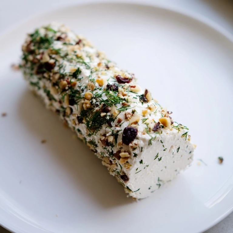 Save to Pinterest A creamy goat cheese log rolled in a snowy blend of herbs, nuts, and dried cranberries perfect for festive gatherings.